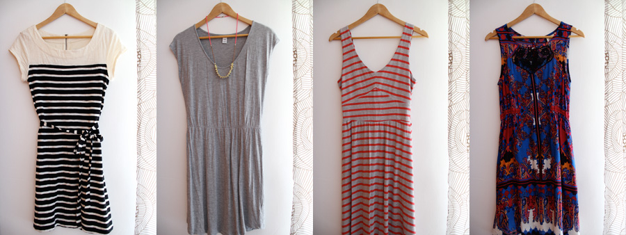 red + grey stripe dress, pink/blue/black pattern dress, blue pattern tank, orange pattern tank, purple tee, rolled jean shorts, newsprint bikini, sweatshirt moto jacket : Anthropologie